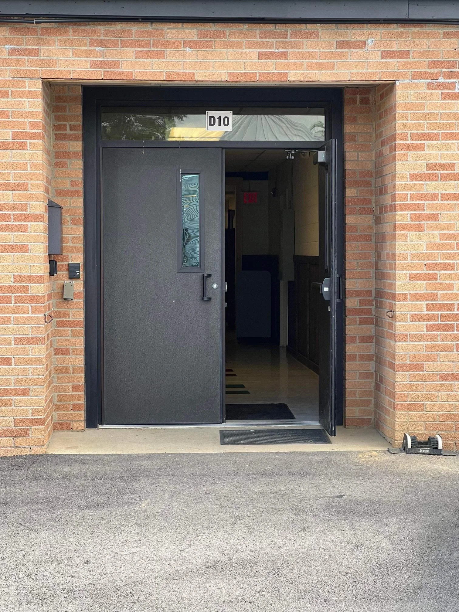 Look for several white service vehicles and double doors marked with a "D10" at the top.